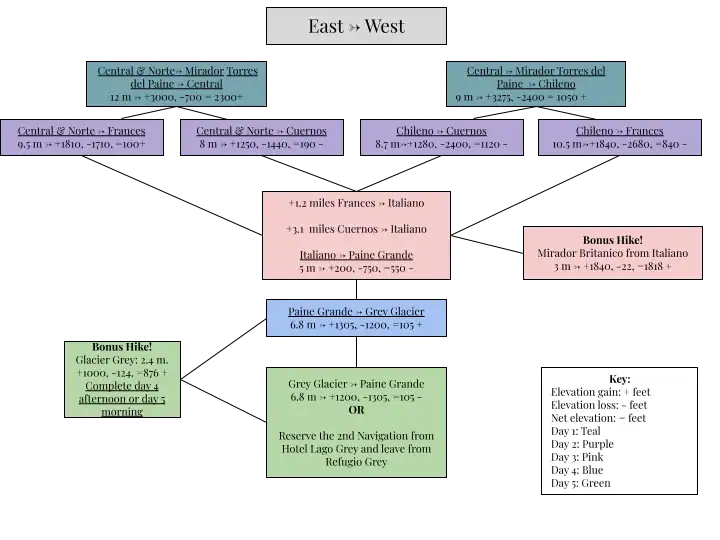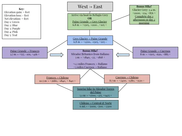 - West to east: Build up over the 4-5 days of hiking. Day 5 culminates in a hike watching the sunrise over Las Torres.