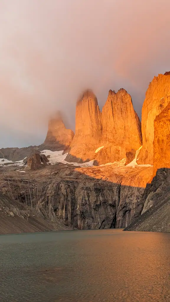 As the horizon softened, sunrise gave us a slow-motion color show. Pastel blues and purples shifted to fiery oranges and pinks as the light climbed. The towers caught and held it like beacons. This was the moment we had spent five days working toward, and seeing it bloom right in front of us felt unreal.
