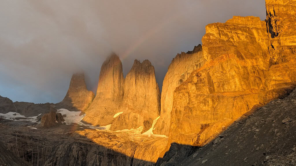 There it is, about seventeen hundred words on our final day of the W Trek: a 3 a.m. start in the rain, a ridge walk into rock steps and boulder hops, a sunrise that shifted from blue to pink to fire, a rainbow, a perfect drink at Las Torres, and the satisfying clunk of a bus seat under tired legs.